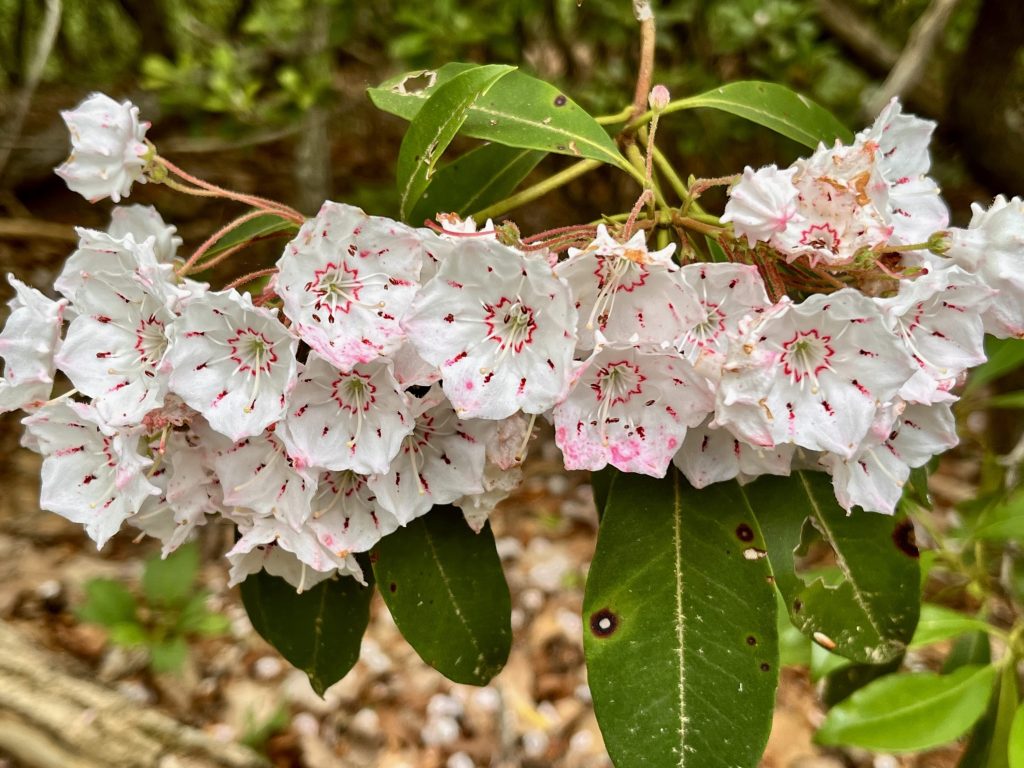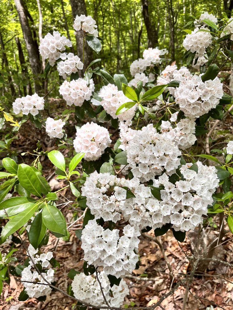 Tuesday and Thursday were conditioning hike days. The first hike was on a trail about three miles from my house called Greens Lick. The 7.6-mile trail with 1,200 ft. elevation gain was a shaded, forested path. The Mountain Laurels were in full bloom and the trail was bountiful with glorious flowers bursting forth in beauty. We traversed over several small streams and found lookouts with beautiful vistas. The adventure was accomplished in 3 hours and 11 minutes.