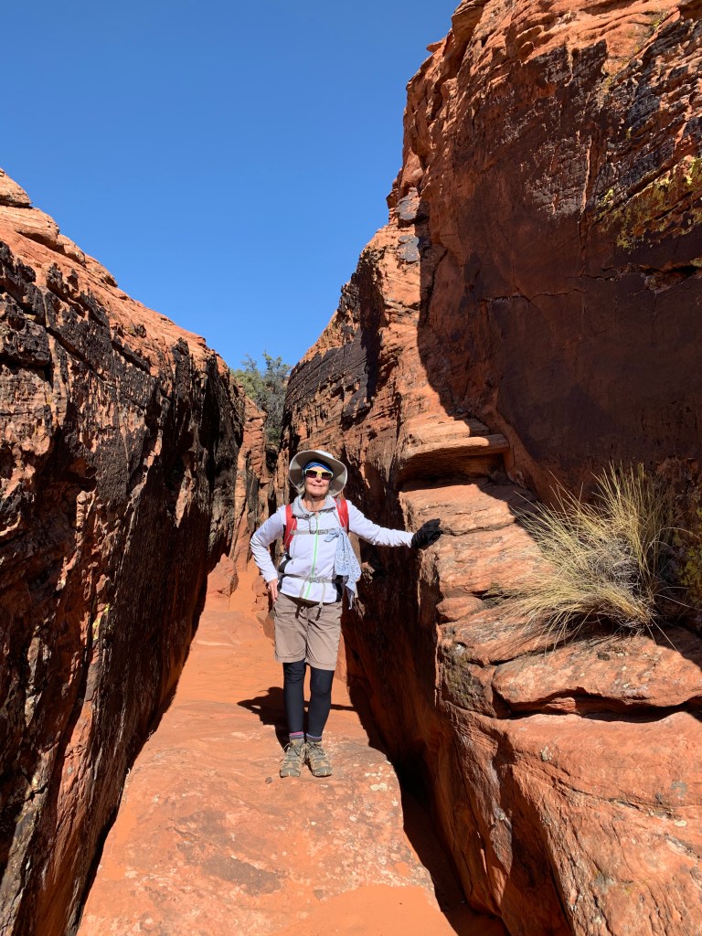 My inspiration goes back to October 2020, and the nation was thawing out from the deep, immobilizing freeze of COVID-19. Travel and hiking are my passions, and I was restless to be on the move. I had places to go, things to see and mountains to climb. I decided to plan a hiking trip in the United States as I felt uneasy about going out of the country. I had been to southwest Utah many years ago when I was in my twenties and remembered the stunning beauty of the red rocky formations of that area. I had wanted to return there for many years and now was the time. I invited a few of my hiking girlfriends to join me on this excursion and two accepted the invitation. Teresa Krueger is a girlfriend I knew from living in southern California in my twenties and Joy Enderle is a girlfriend I knew from my home city of Asheville, NC. Teresa lives in Boise, ID and would join Joy and me in Utah. I had not seen Teresa for about three decades, but we had enjoyed many hiking outings together in southern California.
