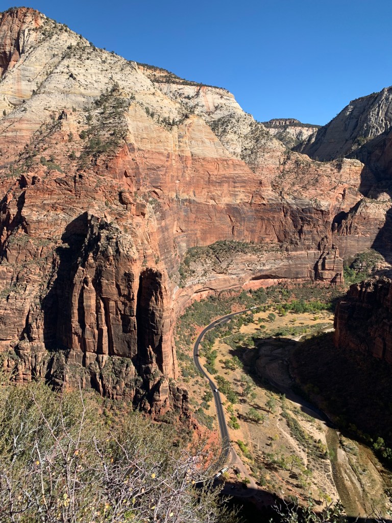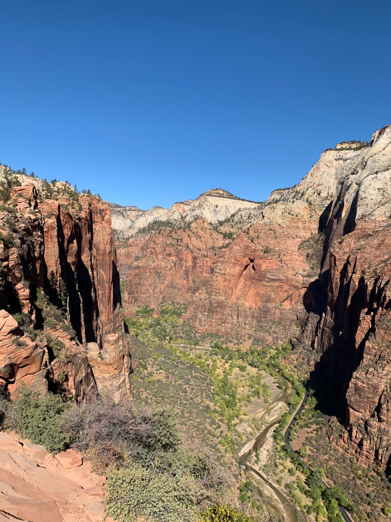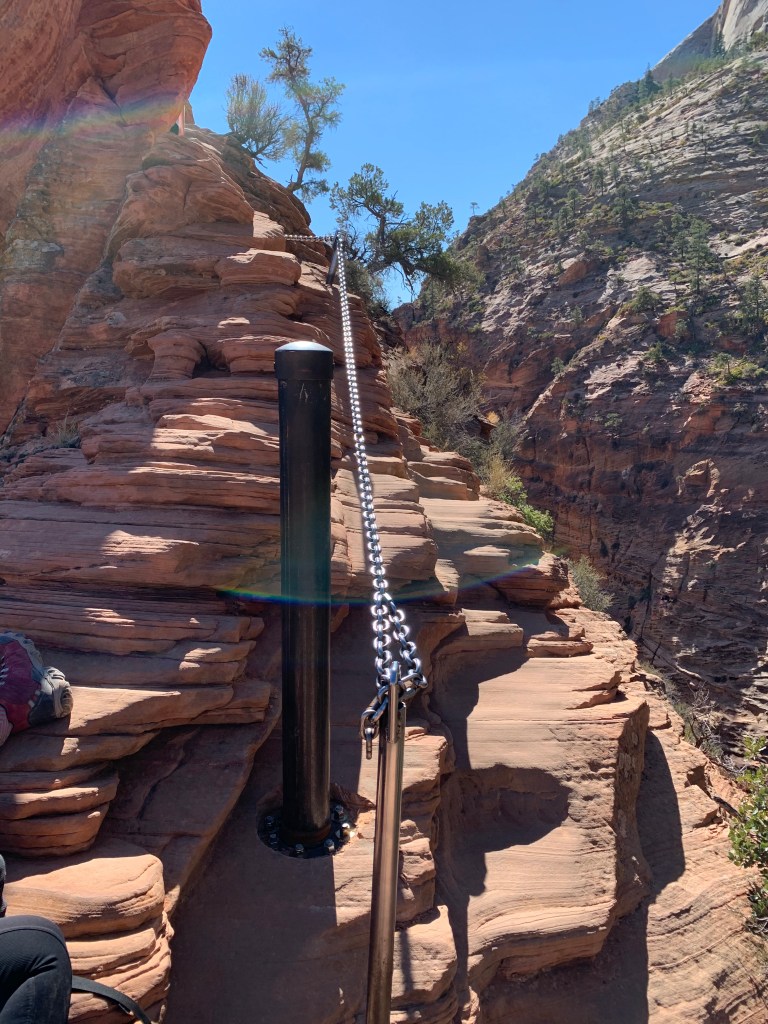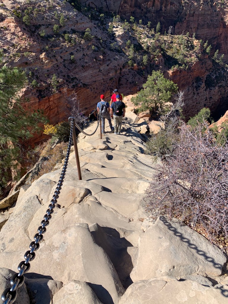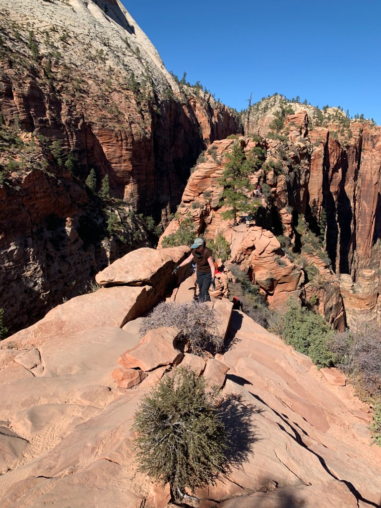 We set up a home base lodging and resting station in a timeshare unit I reserved in St. George, UT. From here we day hiked to various destinations in the area. We had researched places to hike and each of us had our top picks. The first day we hiked near St. George and were wowed by the majestic scenery. Over the next few days, we took in slot canyons, saw petroglyphs, trapsed over petrified sand dunes, and saw many wonders that we ooed and awed over. It was my desire to hike The Narrows at Zion National Park. I had read up on the stunning sites of this river trek and knew it was a highlight to experience. We planned to rent the necessary waterproof boots that were needed for this hike but on the morning we arrived at the park, it was cool, and I was afraid my feet would get cold despite being dry. I do not tolerate having cold hands or feet very well, so we decided not to hike The Narrows but opted to hike Angels Landing instead. I had been set on The Narrows so hadn’t researched Angels Landing and didn’t realize what we were in for when we set out on this momentous hike. It is about 4.5 miles roundtrip with a lot of switchbacks till you arrive at Scout Lookout. At that point the trail takes a dramatically steep climb where you use railings and cables to aid in your ascent. It is a very narrow trail slithering up the ridge of the cliff. There are warning signs along the way advising that many have plunged to their death and if you have any doubts as to your ability to make the trek just forego the climb. Teresa and I decided to start out with the decision that if we felt uncertain at any point we would turn around and go back down. Joy opted to wait for us at Scout Lookout. We took the approach to just look ahead and not look to the steep cliffs on either side of the trail. We just put one foot in front of the other and gracefully slid to the side when we needed to let another hiker pass. The 500-foot elevation gain in that half mile was very steep and treacherous indeed but we made it to the peak. I remember being on top of Angels Landing with a 360-degree viewpoint advantage looking over the Zion National Park valley. It was exhilarating. I was there at the pinnacle. I was 65 years old with Parkinson’s Disease and I was on top! I felt like screaming at the top of my lungs to tell the world that Parkinson’s was not going to hold me back. It was not going to control my life. The feeling was addicting, and I knew I would look for other triumphant moments.